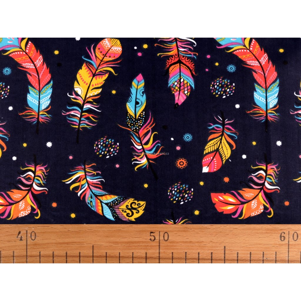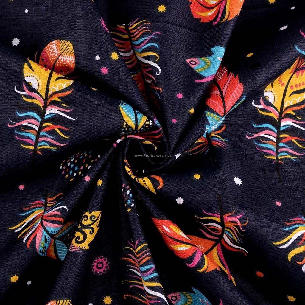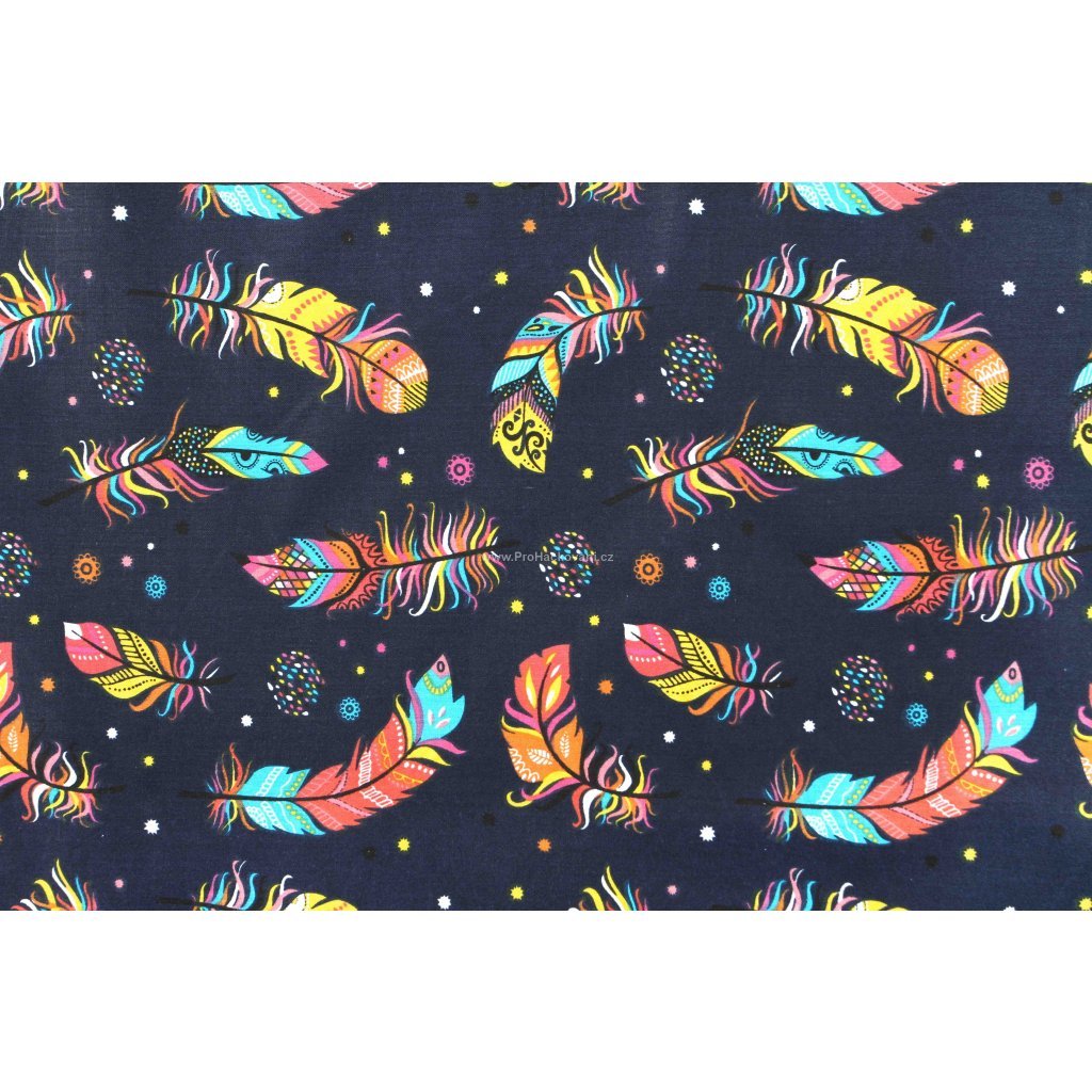 Bavlněná látka barevná pírka na tmavě modré 0,8 m