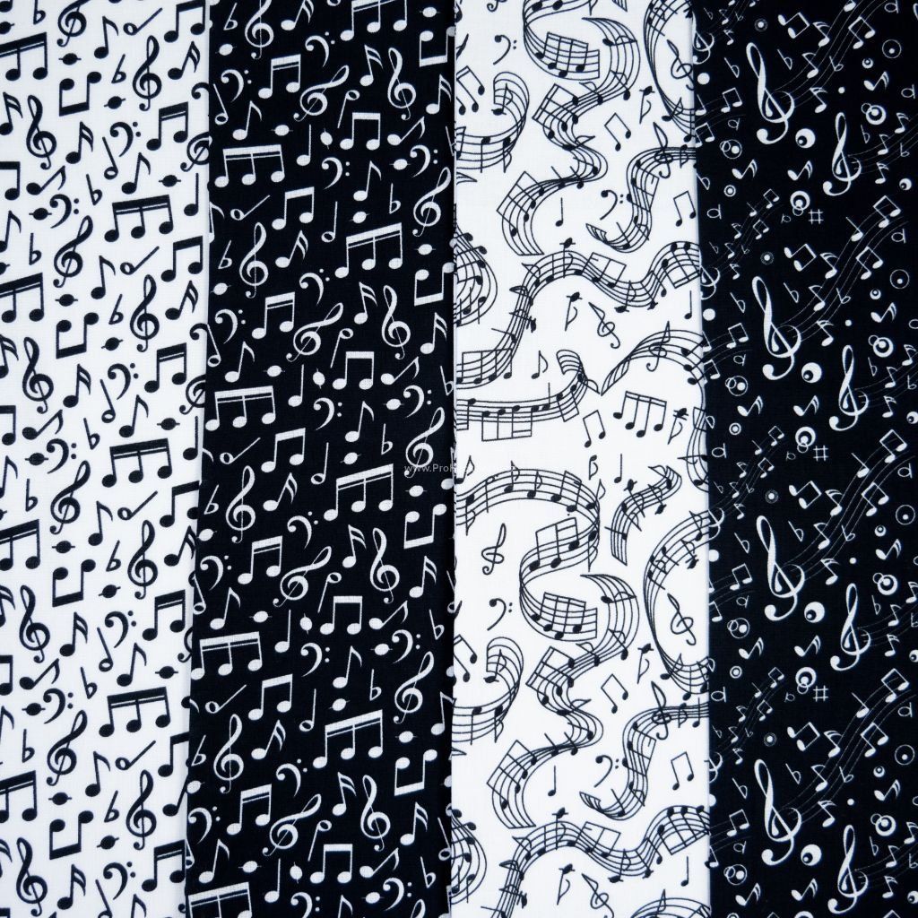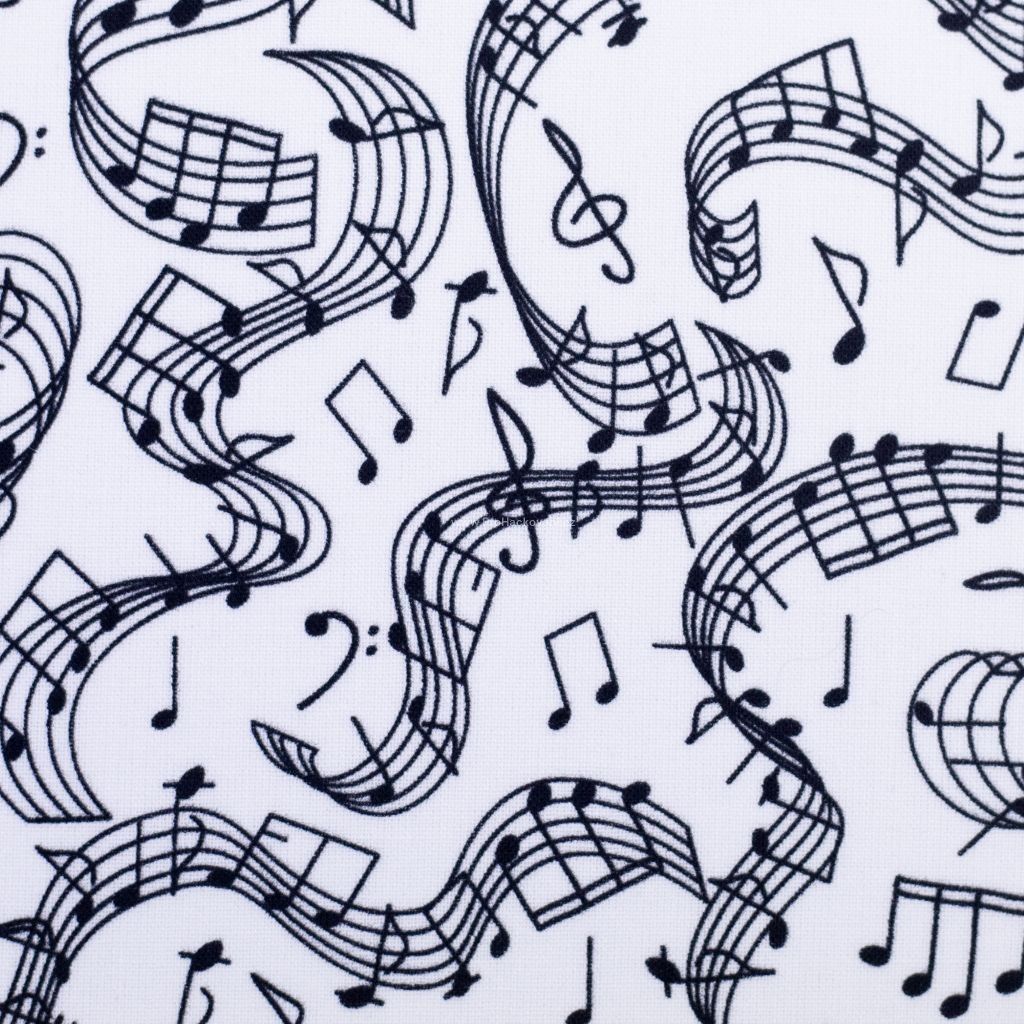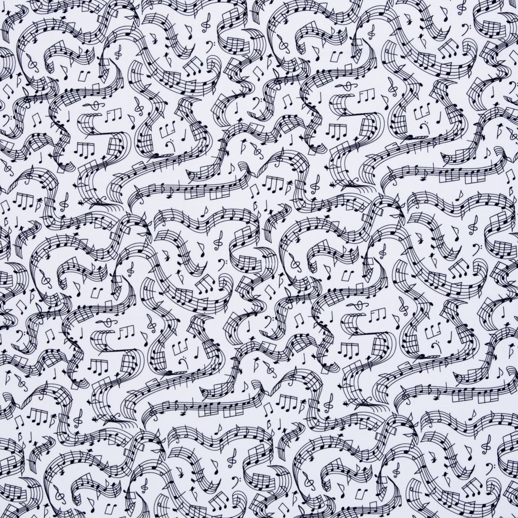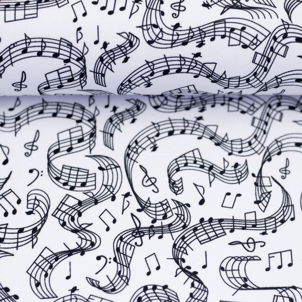Originální bavlněná látka z kolekce Tim zaujme elegantním motivem černých not a hudebních osnov na bílém podkladu. Vzor tvoří plynule se vlnící linky notové osnovy doplněné o jednotlivé noty a hudební symboly, které působí lehce a hravě.