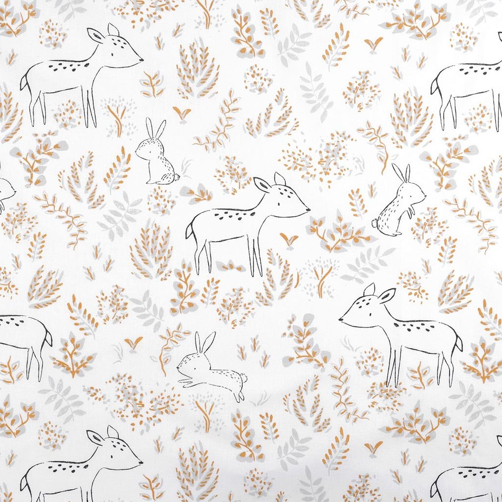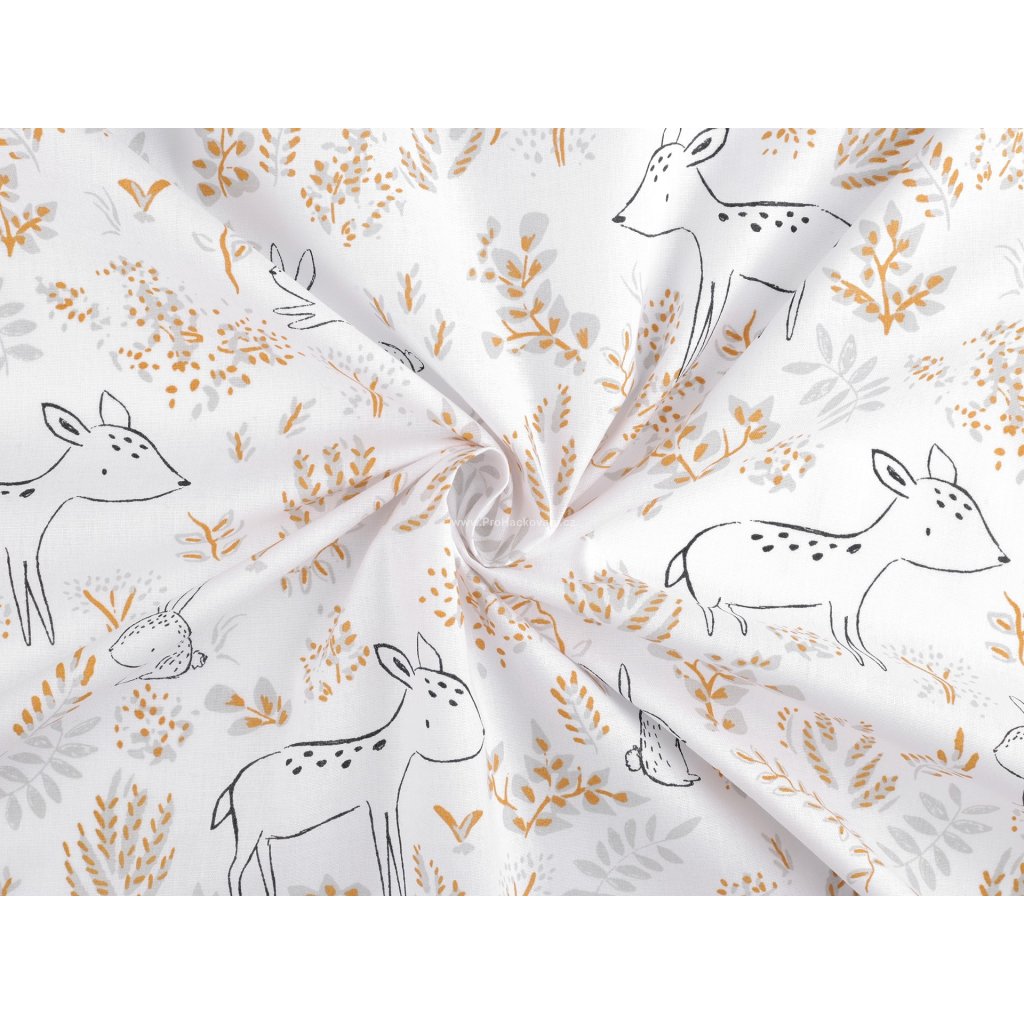 Toto kvalitní bavlněné plátno s krásným jemným motivem zajíčků a srnek vykresleného černou kresbou využijete při Vašem šití a tvoření např. na povlečení, polštáře, závěsy, teepee, deky a jiné bytové dekorace především pro děti, ale nejen pro ně.