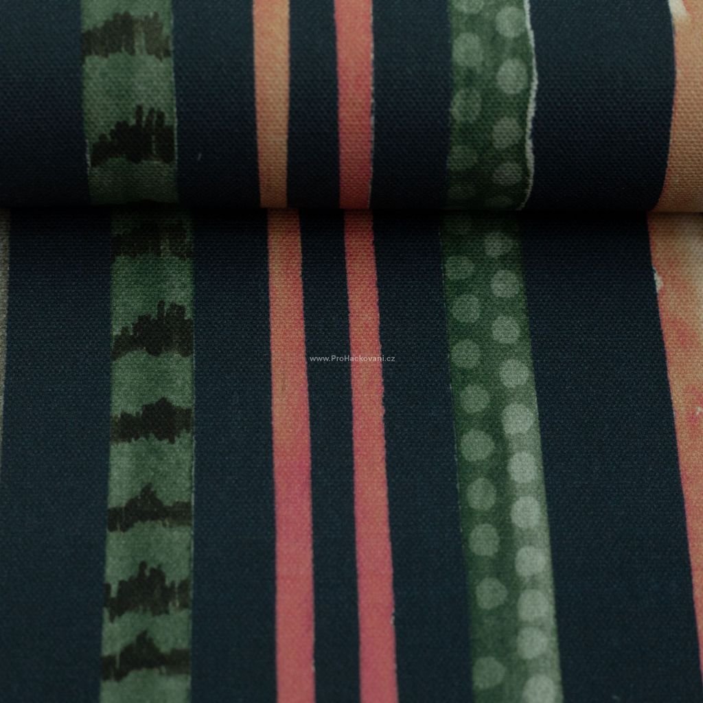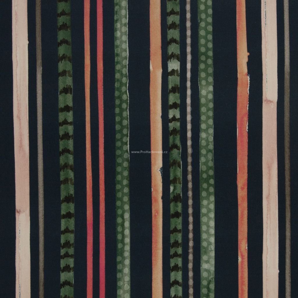 Tato 100% bavlněná látka s přírodní strukturou a střední gramáží má motiv akvarelových pruhů v přírodních tónech.