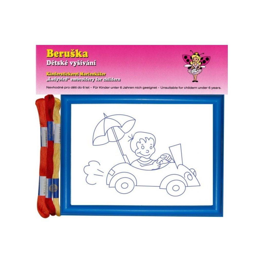 Dětská vyšívací sada v rámečku s předlohou - kluk v autě.