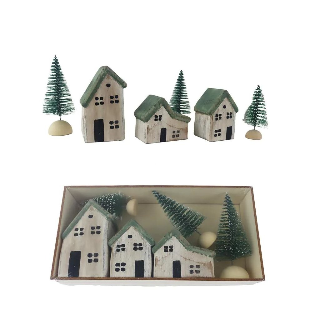 Tato dřevěná vesnička s bílými domečky, zelenou střechou a zelenými zasněženými stromečky je krásným doplňkem pro zimní i vánoční tvoření.