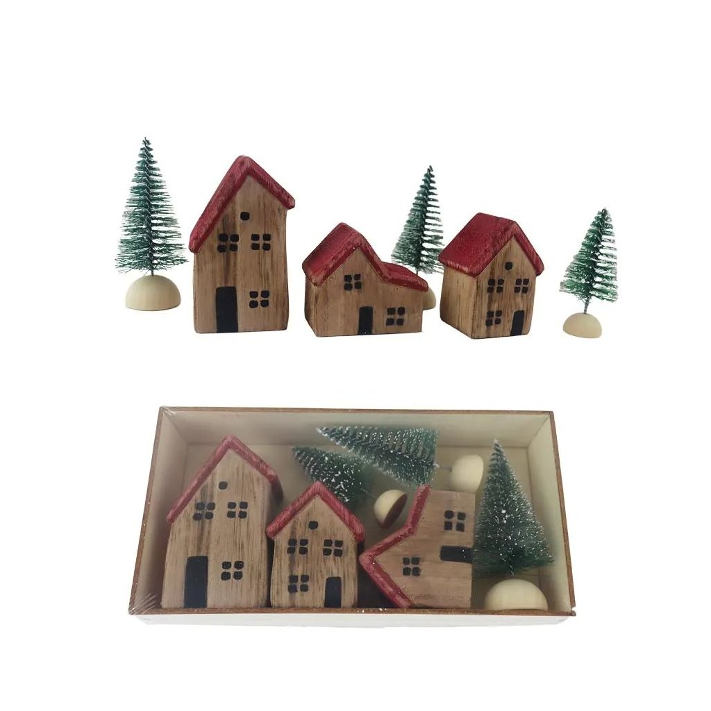 Tato dřevěná vesnička s přírodními domečky, červenou střechou a zelenými zasněženými stromečky je krásným doplňkem pro zimní i vánoční tvoření.