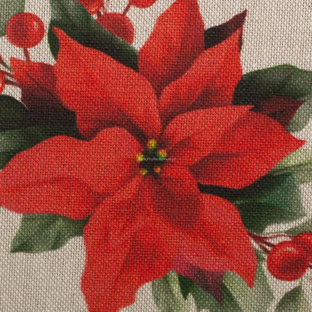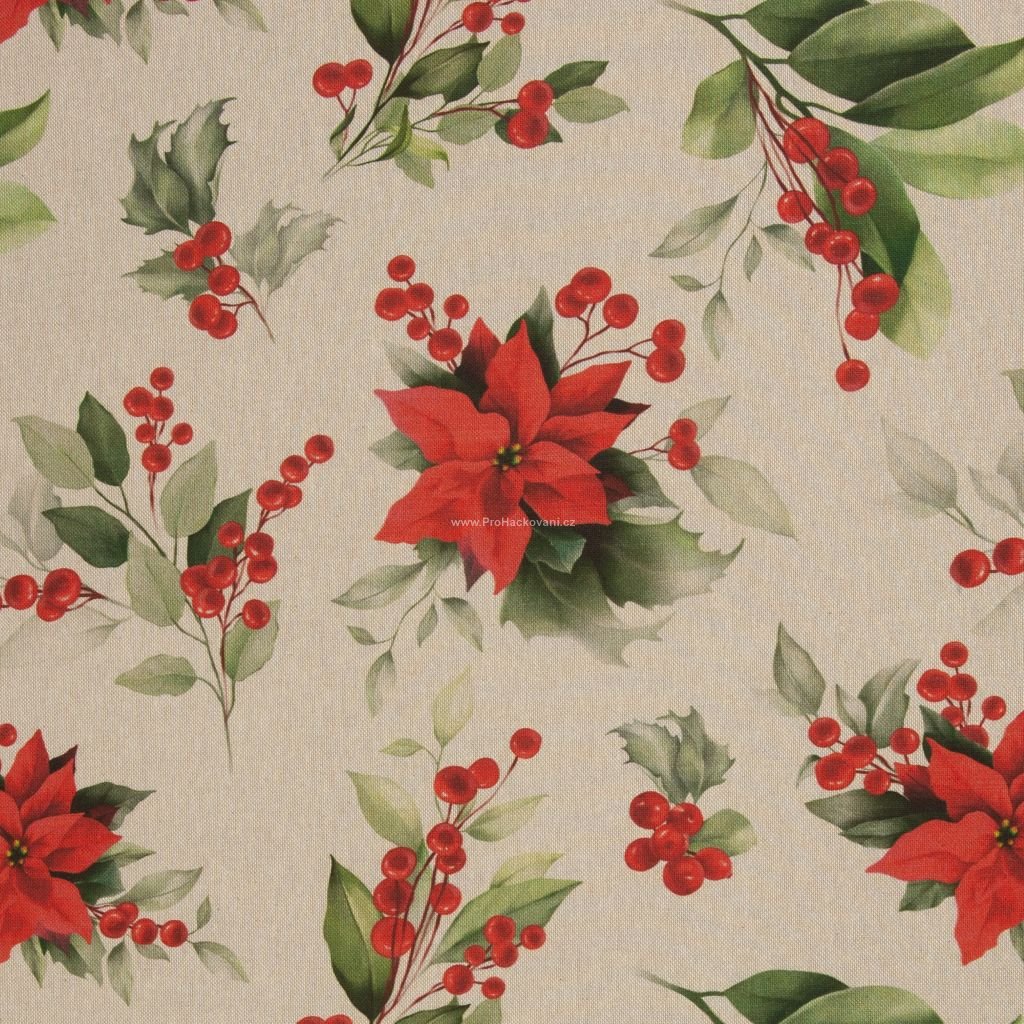Tato elegantní dekorační látka z kolekce Christmas zaujme jemným motivem vánočních hvězd (květin) v tradičních červených odstínech na přírodním béžovém podkladu. Kombinace výrazných květin a neutrálního tónu vytváří teplou a sváteční atmosféru, která se skvěle hodí do každého vánočního interiéru.