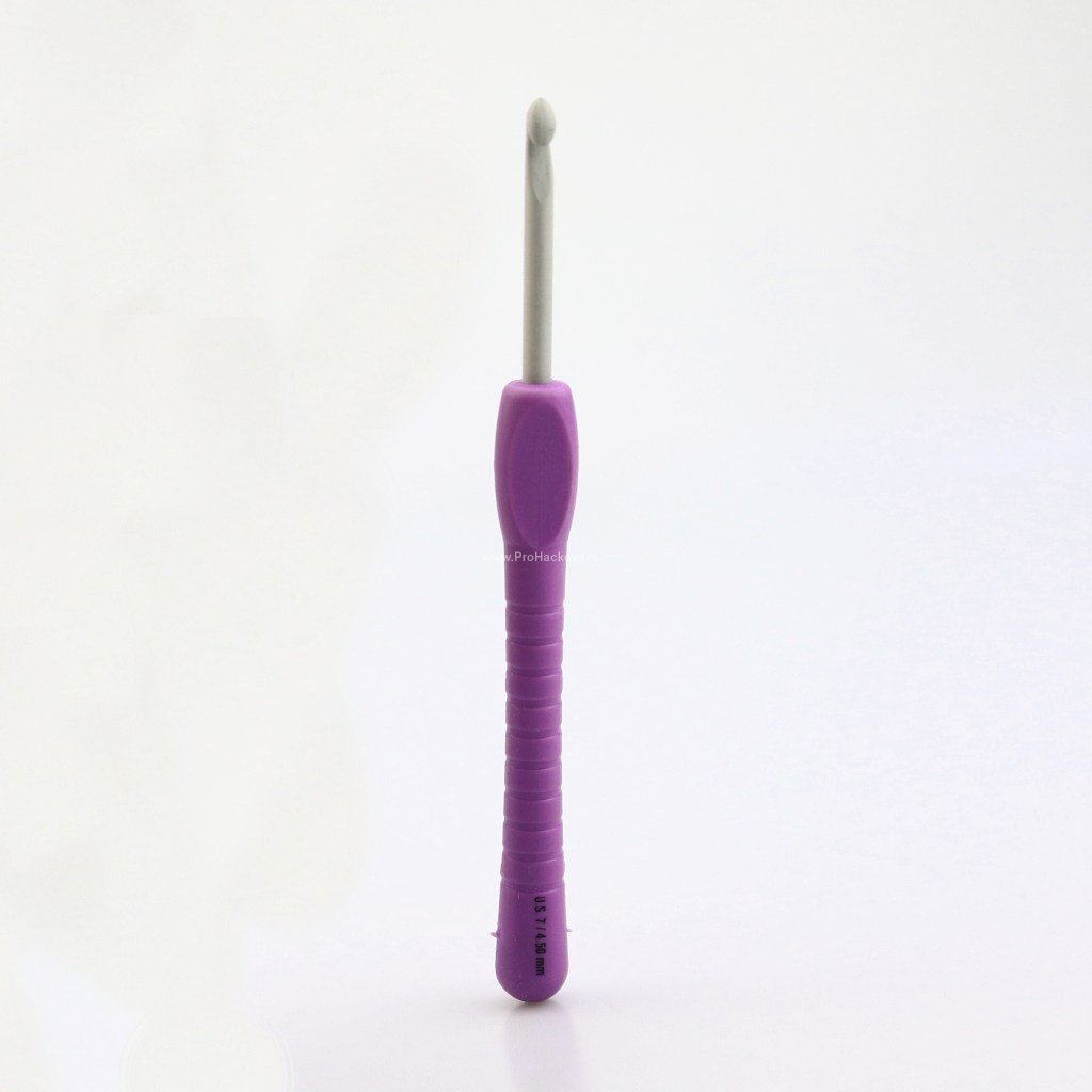hliníku, díky čemuž je pevnější než plastové háčky. Povrch je potažen hladkou šedou barvou pro snadnější háčkování