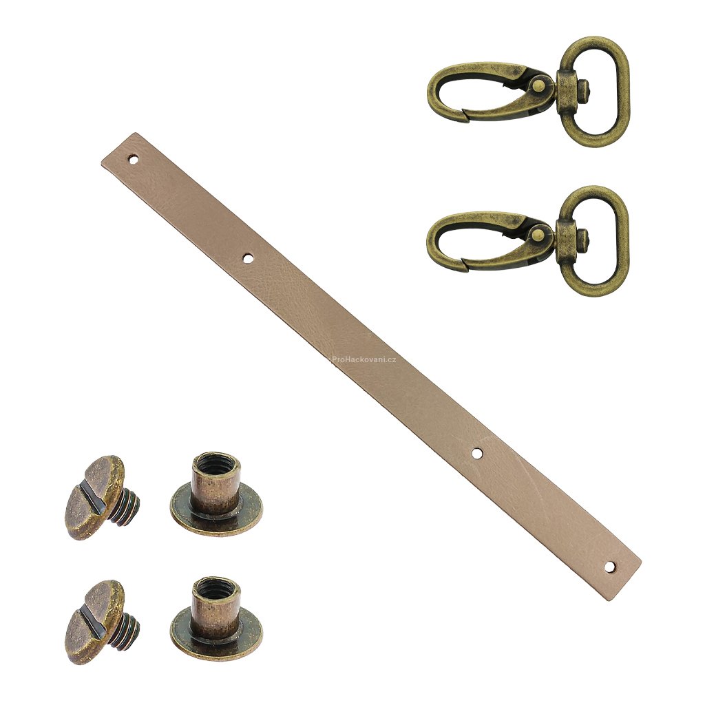 Sada kožený popruh 22 cm š. 2,5 cm bílá káva s karabinou staromosaz