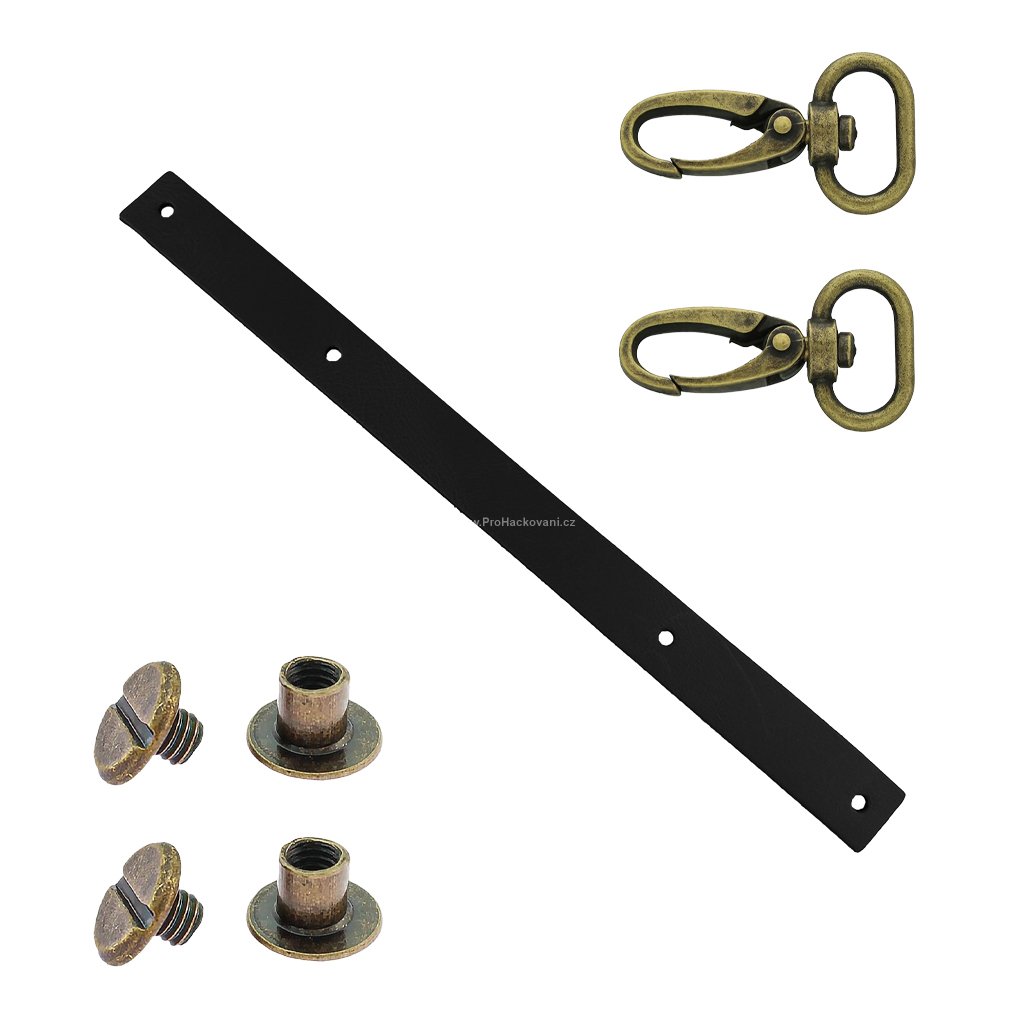 Sada kožený popruh 22 cm š. 2,5 cm černý s karabinou staromosaz