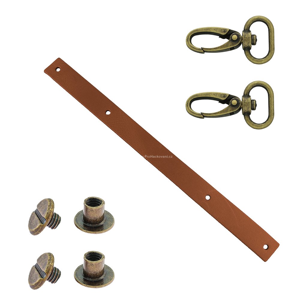 Sada kožený popruh 22 cm š. 2,5 cm hnědý s karabinou staromosaz
