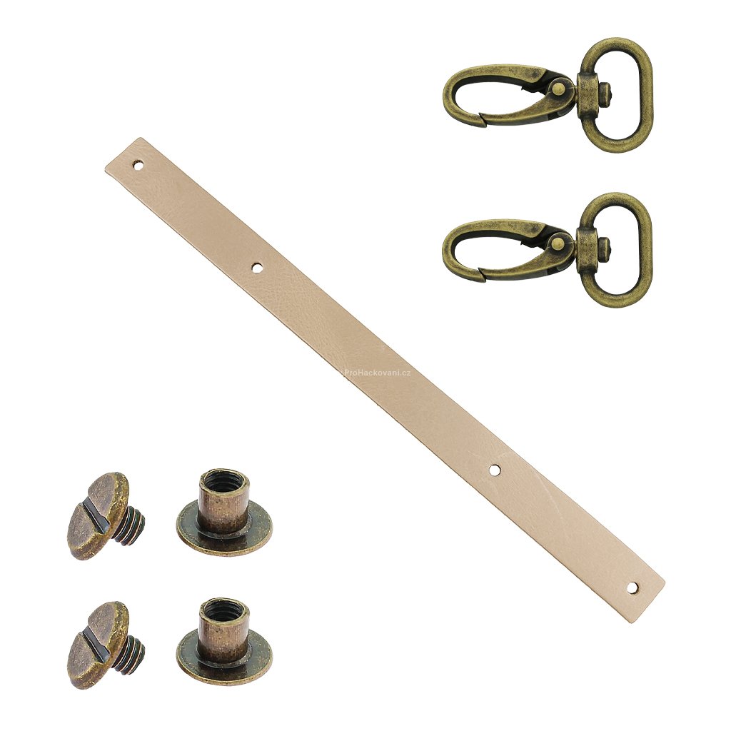 Sada kožený popruh 22 cm š. 2,5 cm krémový s karabinou staromosaz