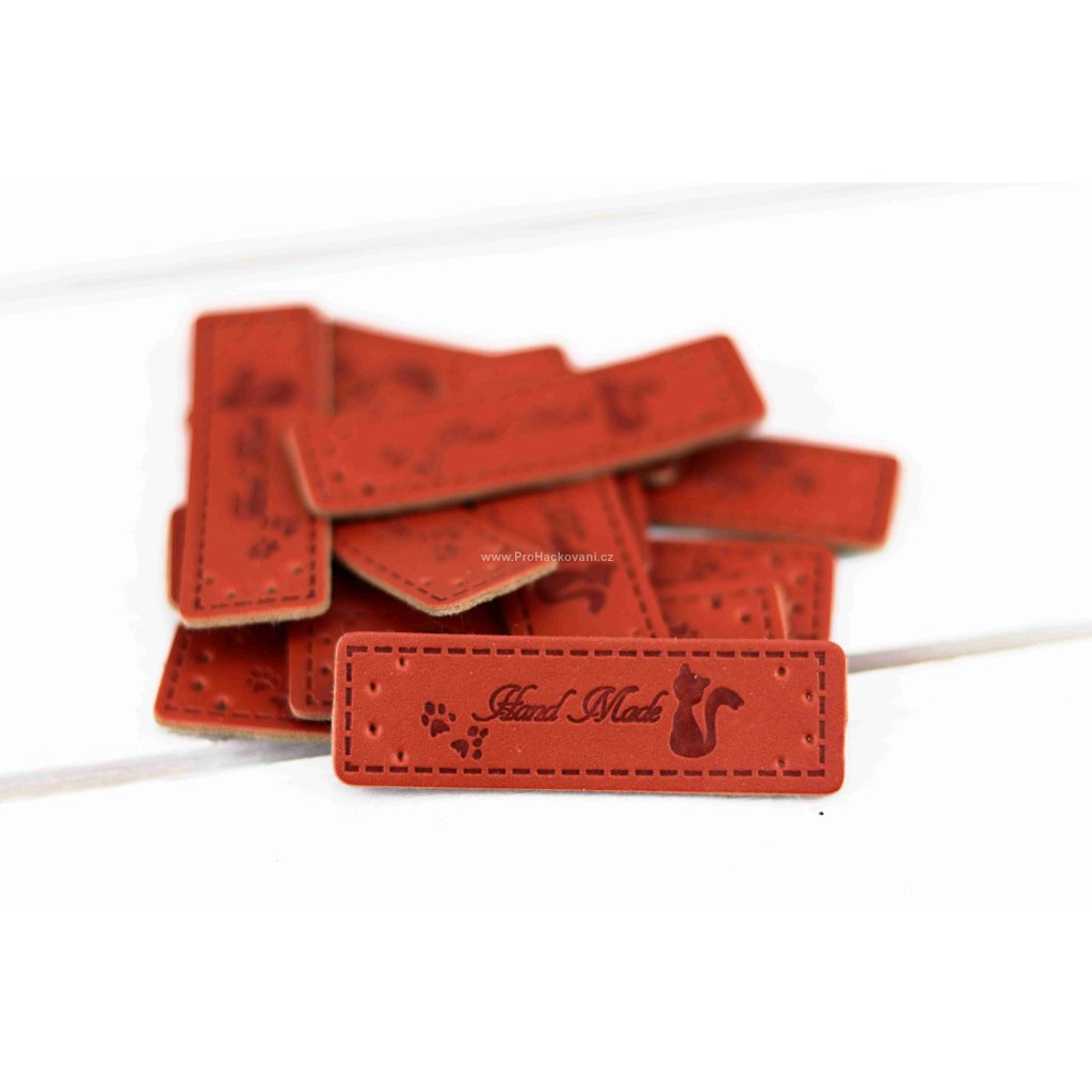 Konženková cedulka Hand Made v hnědé barvě s obrázkem kočky dodá stylový a originální vzhled vašemu výrobku, ať už je to kabelka, taška, deka nebo potah na polštář.