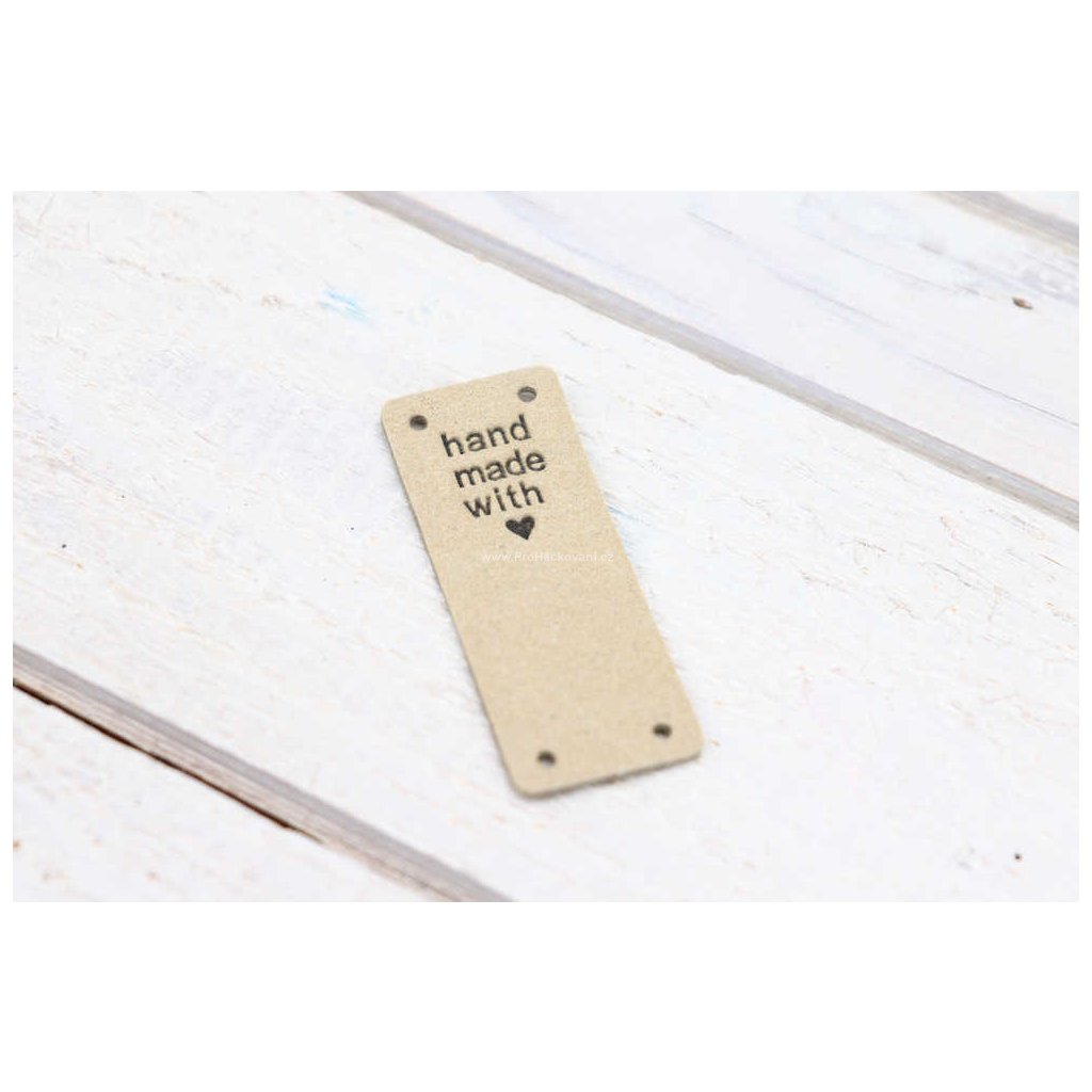 Koženkovou cedulku s vyraženým nápisem Hand Made with ♥ snadno přehnete přes okraje čepice, svetru, kabelky či jiných vlastnoručně vyráběných produktů.