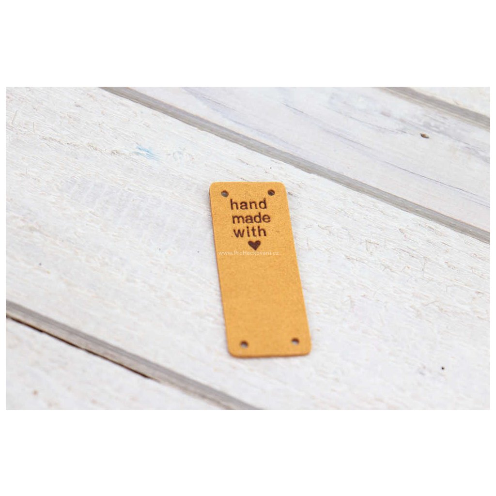 Koženkovou cedulku s vyraženým nápisem Hand Made with ♥ snadno přehnete přes okraje čepice, svetru, kabelky či jiných vlastnoručně vyráběných produktů.