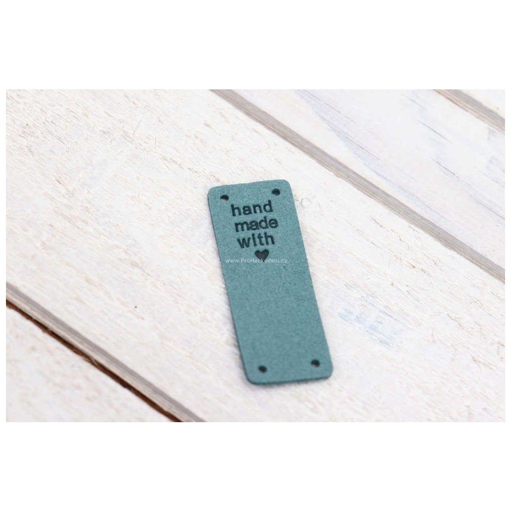 Koženkovou cedulku s vyraženým nápisem Hand Made with ♥ snadno přehnete přes okraje čepice, svetru, kabelky či jiných vlastnoručně vyráběných produktů.