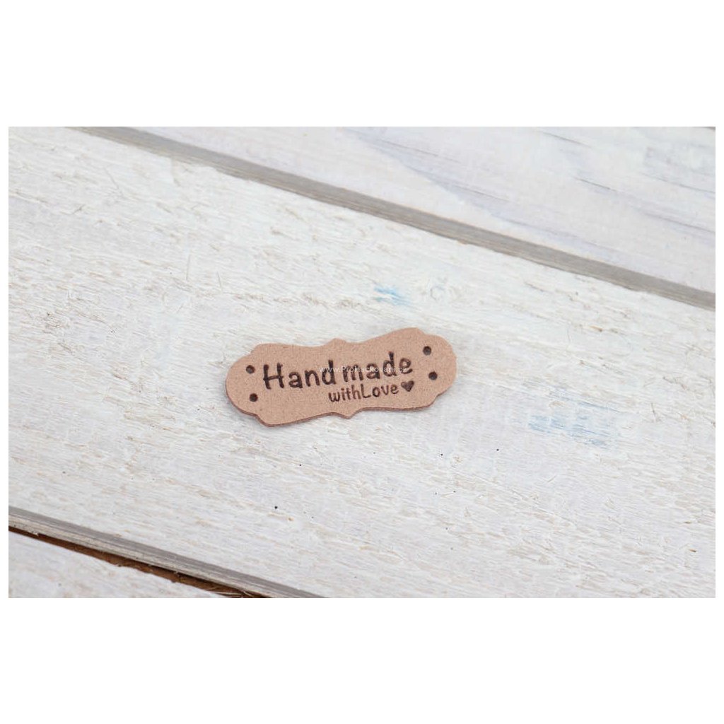 Koženková cedulka v atypickém tvaru a vyraženým nápisem Hand Made with love se srdíčkem je vhodná jako štítek na vlastnoručně vyráběné produkty.