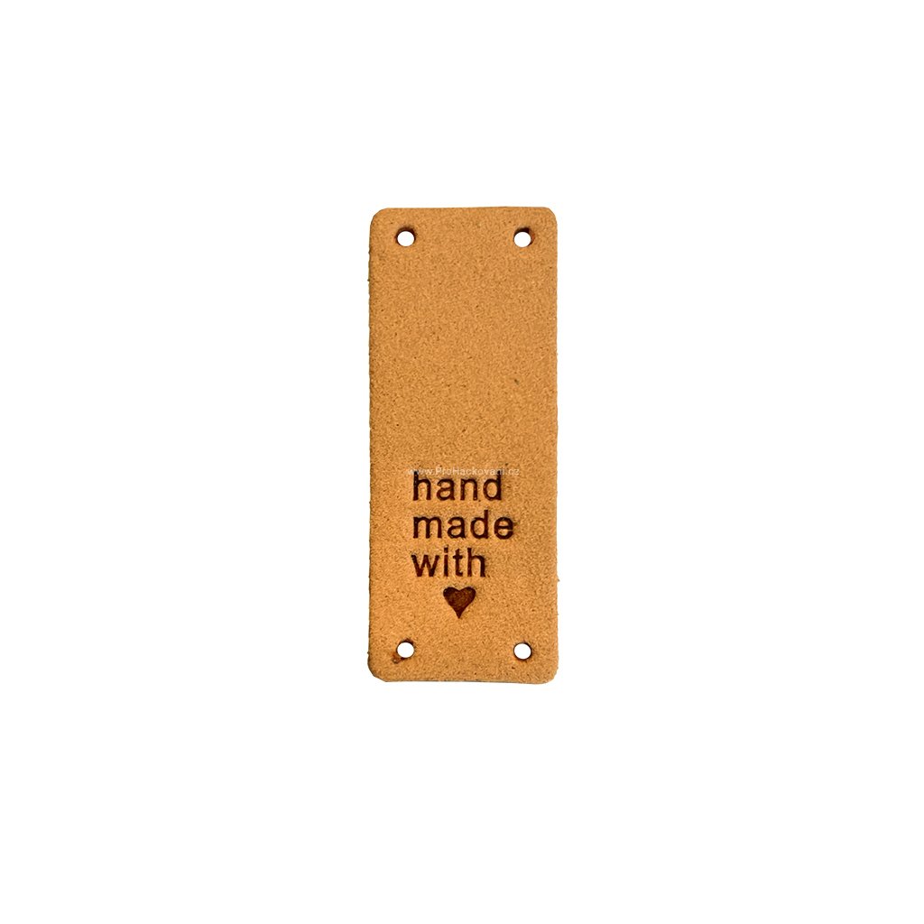 Koženkovou cedulku s vyraženým nápisem Hand Made with ♥ snadno přehnete přes okraje čepice, svetru, kabelky či jiných vlastnoručně vyráběných produktů.
