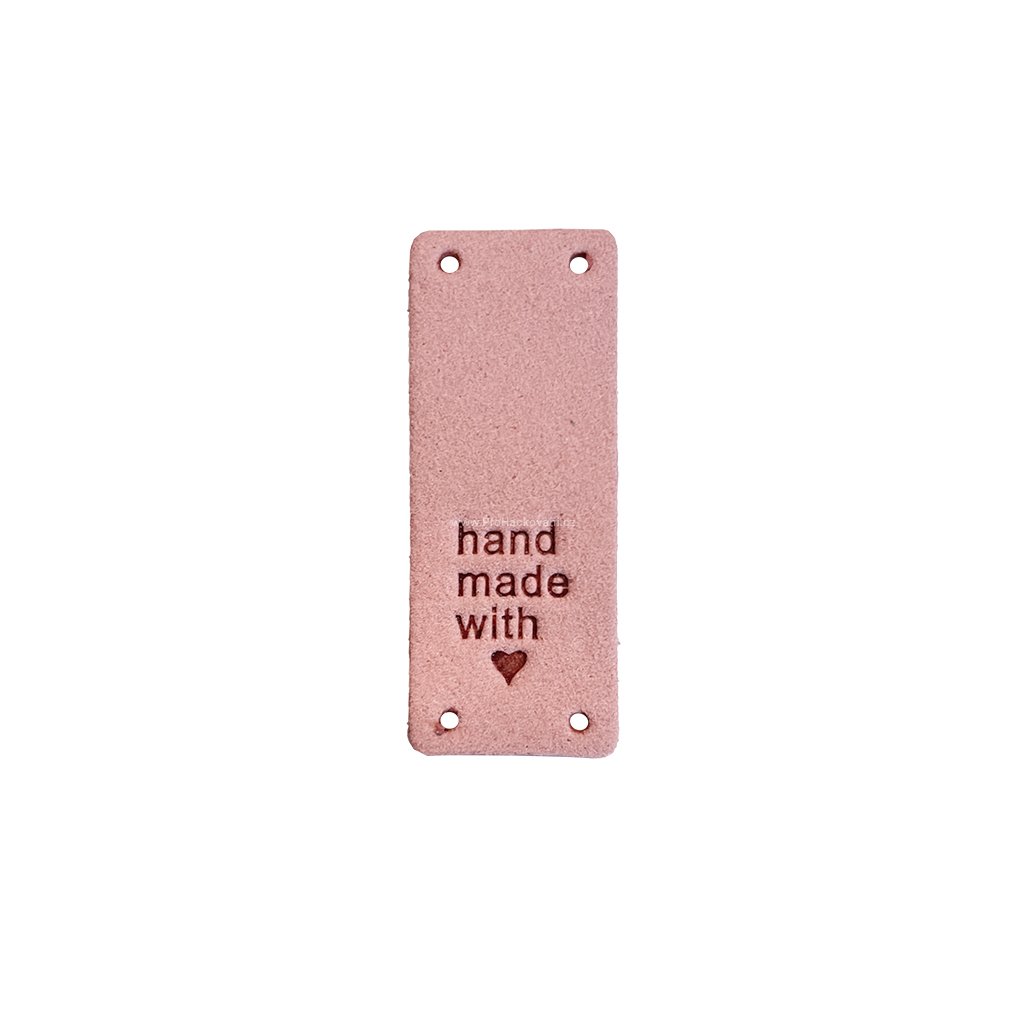 Koženkovou cedulku s vyraženým nápisem Hand Made with ♥ snadno přehnete přes okraje čepice, svetru, kabelky či jiných vlastnoručně vyráběných produktů.