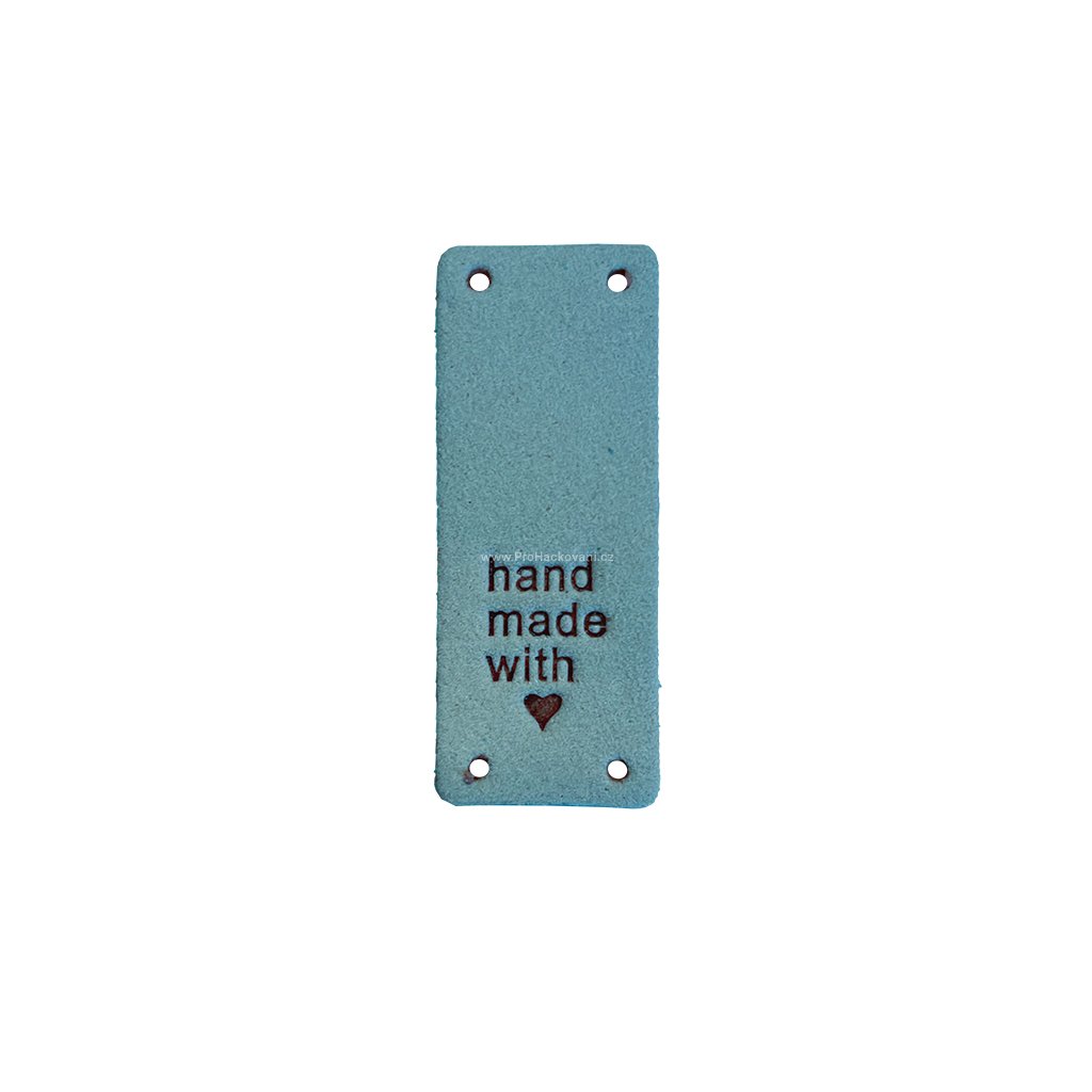 Koženkovou cedulku s vyraženým nápisem Hand Made with ♥ snadno přehnete přes okraje čepice, svetru, kabelky či jiných vlastnoručně vyráběných produktů.