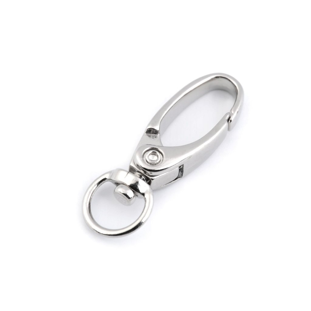 Kovová karabina je otočná. Využijete ji k výrobě klíčenek, vodítek pro psy nebo k připevnění popruhů na tašky a kabelky.