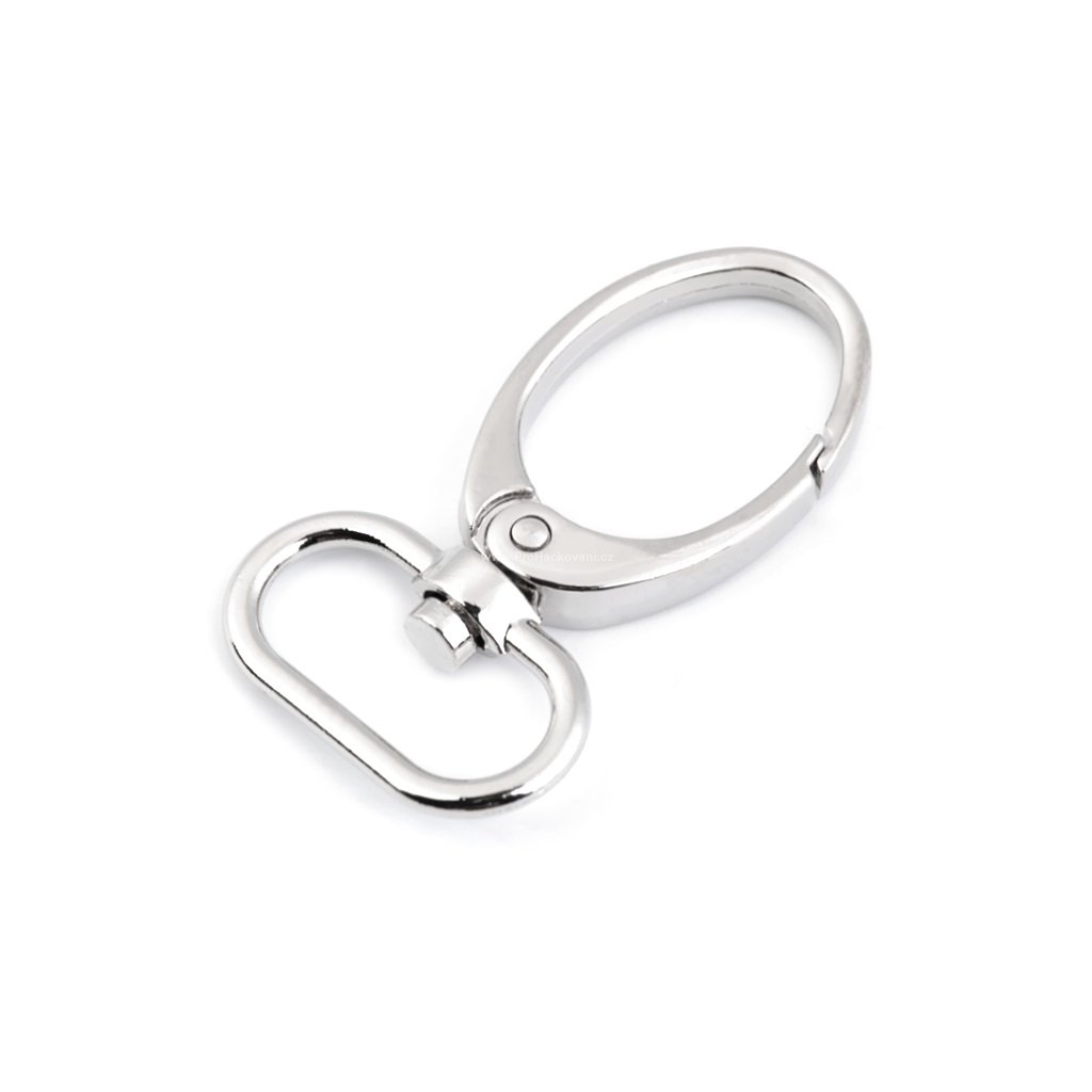 Kovová karabina je otočná. Využijete ji k výrobě klíčenek, vodítek pro psy nebo k připevnění popruhů na tašky a kabelky.