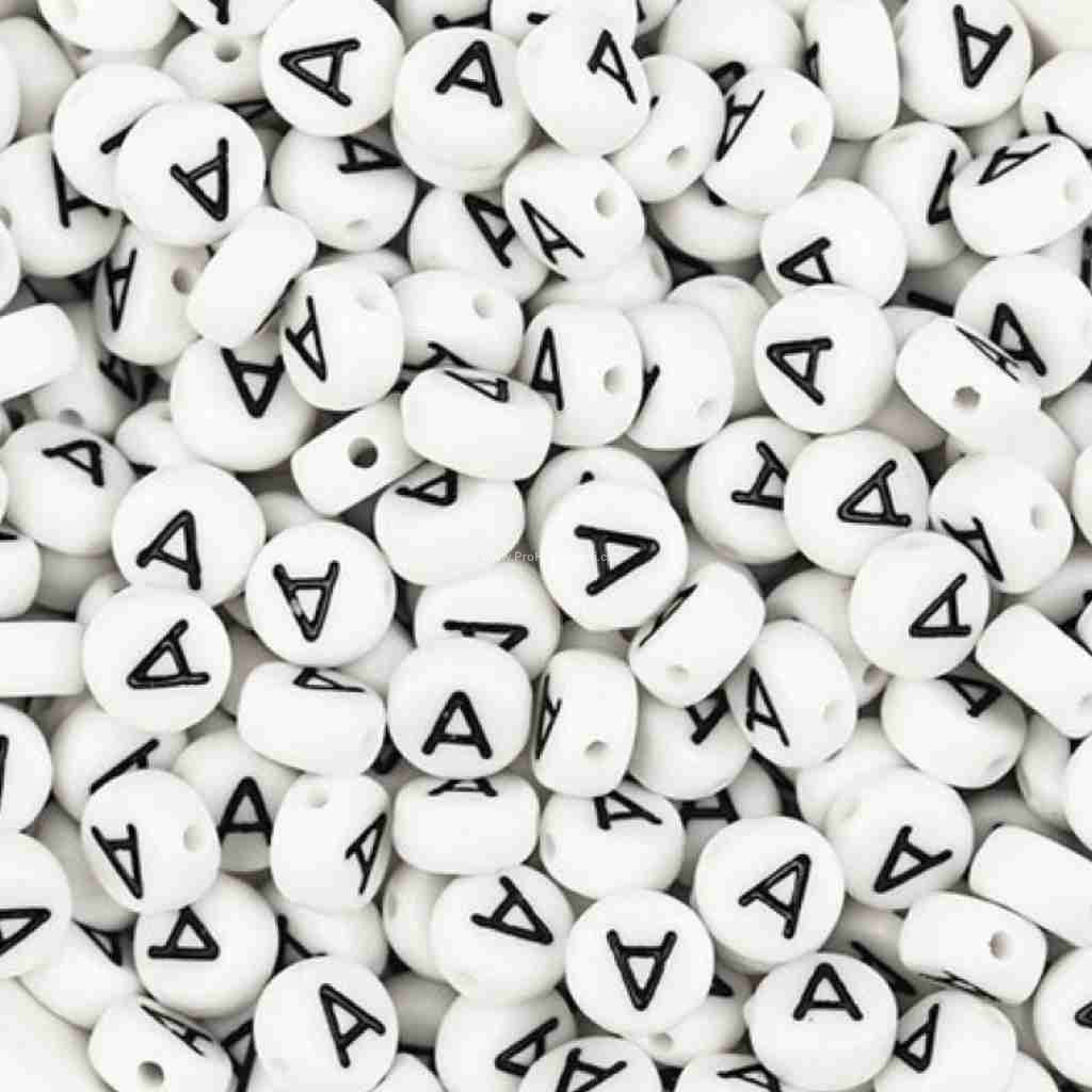Korálky - bílé lentilky s písmenem A z akrylové hmoty o průměru 7 mm, výšce 4 mm a průvlekem 1 mm. Korálek má barvu bílou a písmenko je černé.
