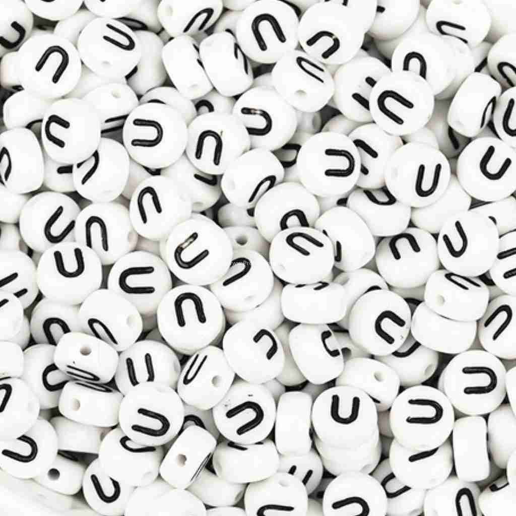 Korálky - bílé lentilky s písmenem U z akrylové hmoty o průměru 7 mm, výšce 4 mm a průvlekem 1 mm. Korálek má barvu bílou a písmenko je černé.