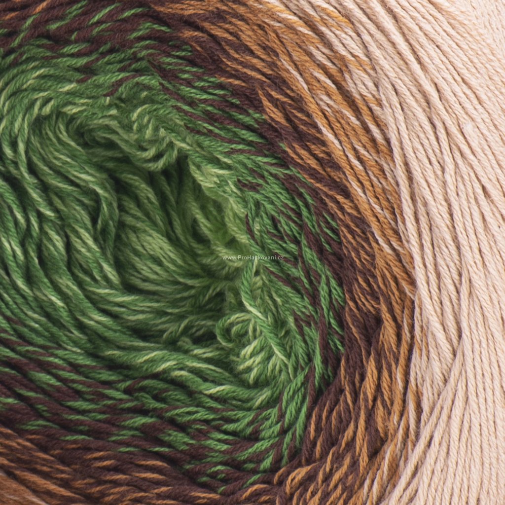 příze Flowers 308 světle zelená, zelená, hnědá.