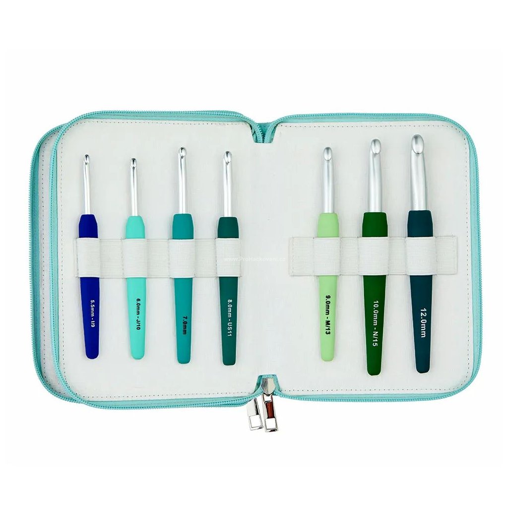 Tato sada obsahuje 14 hliníkových háčků ve velikostech od 2,0 mm až po 12 mm, takže v ní najdete ideální háček pro jemné krajkové vzory i pro práci se silnou přízí.