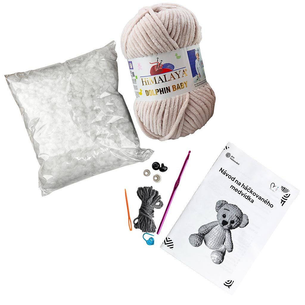 Sada obsahuje vše potřebné pro uháčkování medvídka o velikosti cca 28 cm.