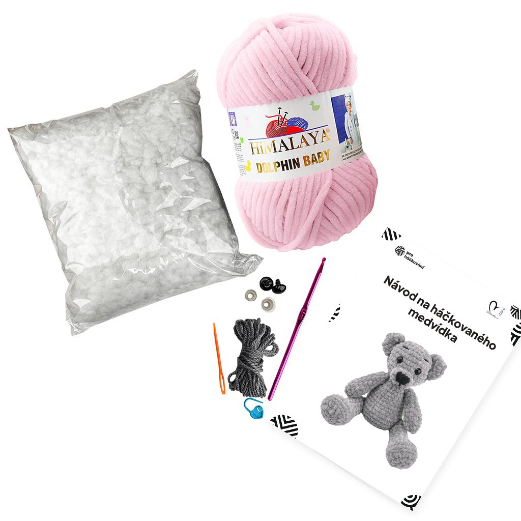 Sada obsahuje vše potřebné pro uháčkování medvídka o velikosti cca 28 cm.