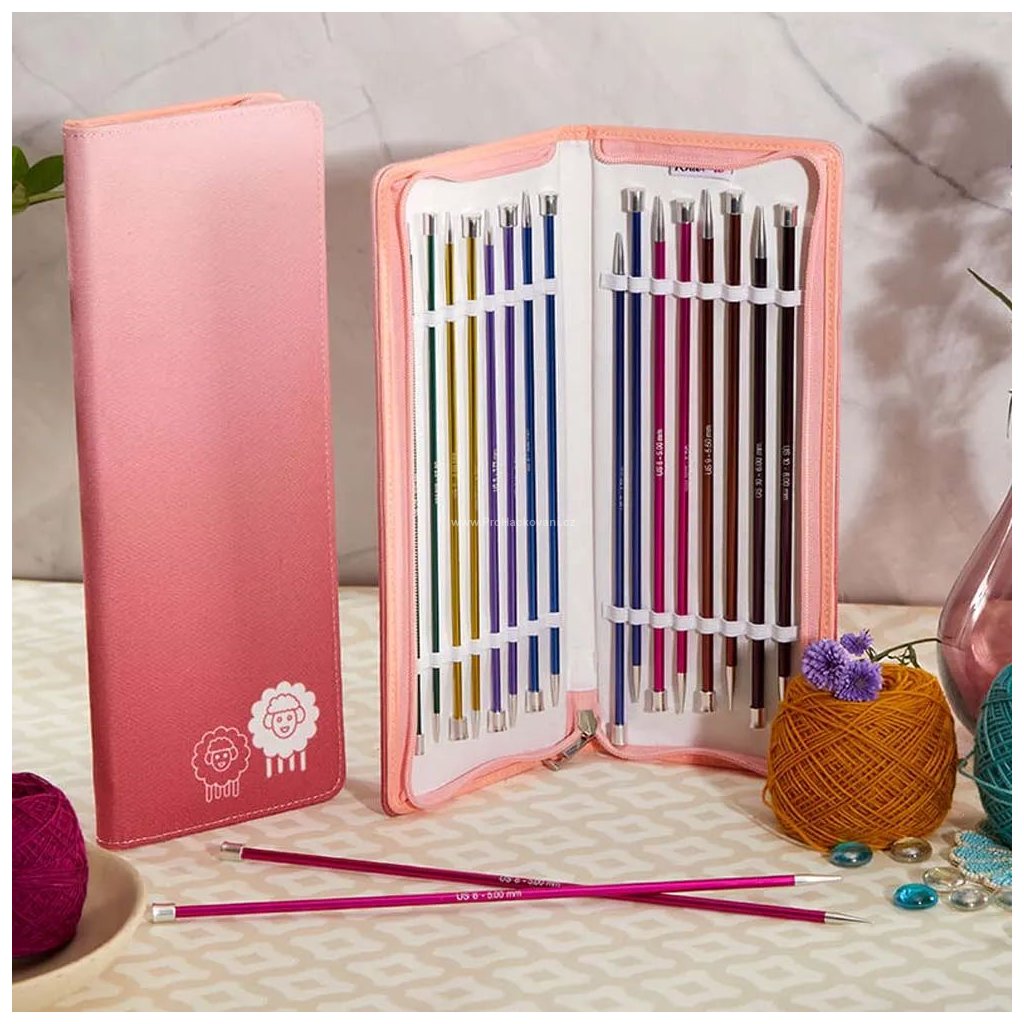 Celá sada je uložena v elegantním růžovém pouzdře na zip, které chrání jehlice a pomáhá udržet vše krásně uspořádané.