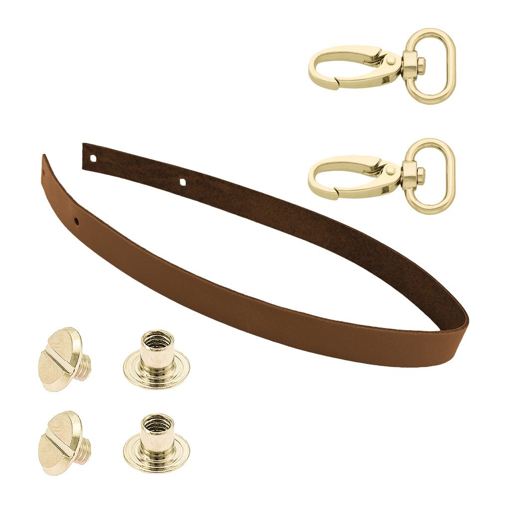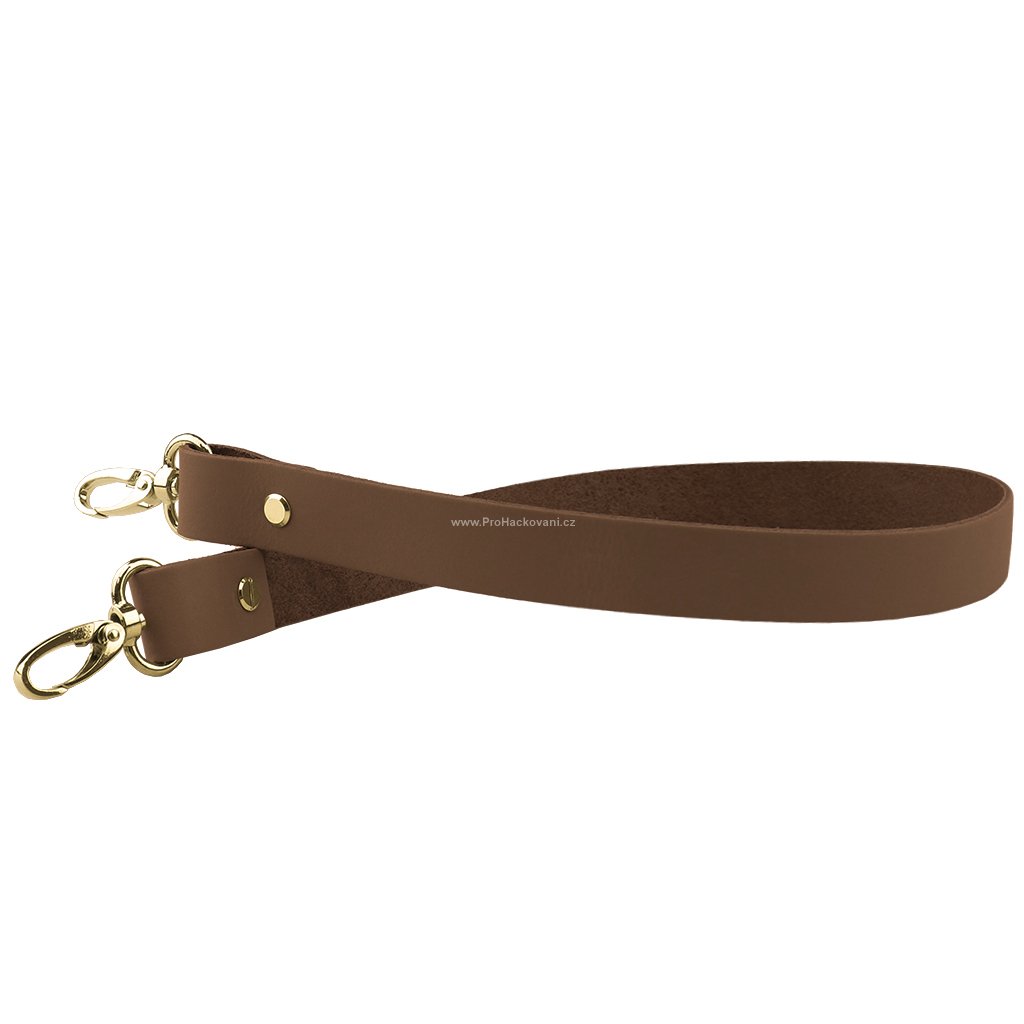 Sada kožený popruh 62 cm š. 2 cm tmavě hnědý s karabinou zlatá