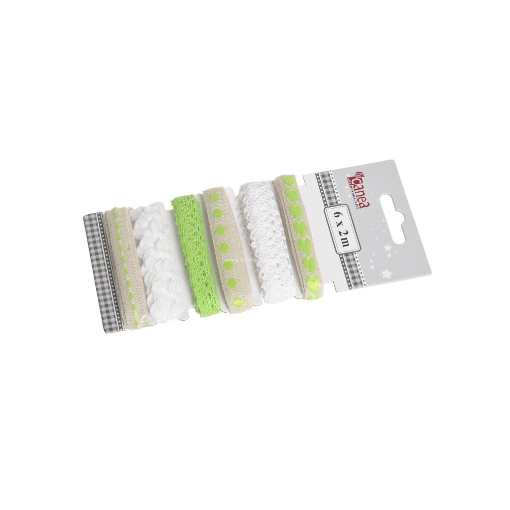 Sada obsahuje: 1 x stuha s puntíky, 1 x stuha se srdíčky, 1 x stuha jednobarevná vlnka, 1 x stuhy s prošíváním a 2 x krajková stuha.