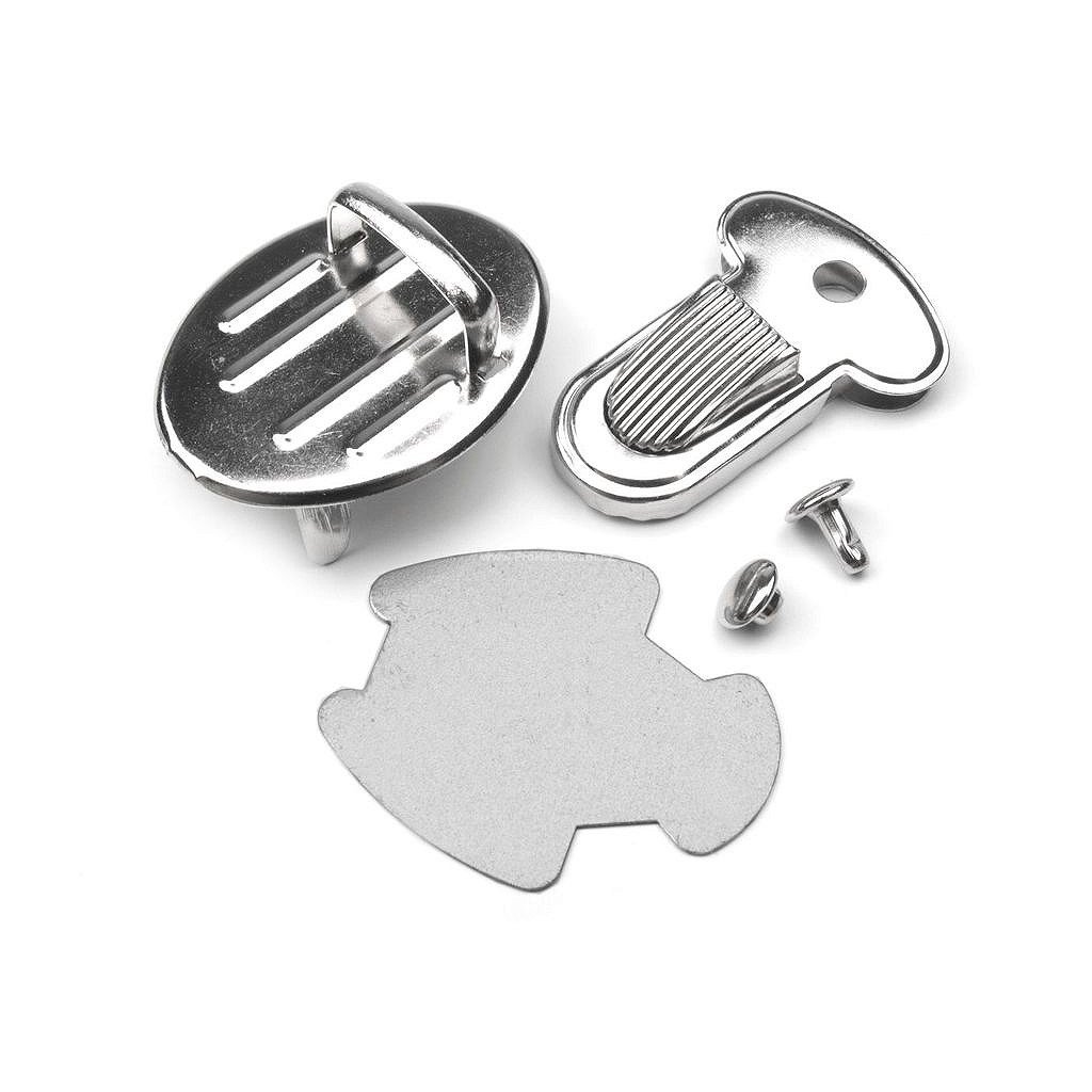 Zapínání se skládá ze tří dílů. Jeden díl se připevní na vnitřní část kabelky, druhý na vnější část kabelky a třetí díl na chlopeň kabelky. Pak už jen stačí zasunout do sebe tak, až uslyšíte cvaknutí. Potom je teprve kabelka bezpečně uzavřena. Součástí sady jsou nýtky.