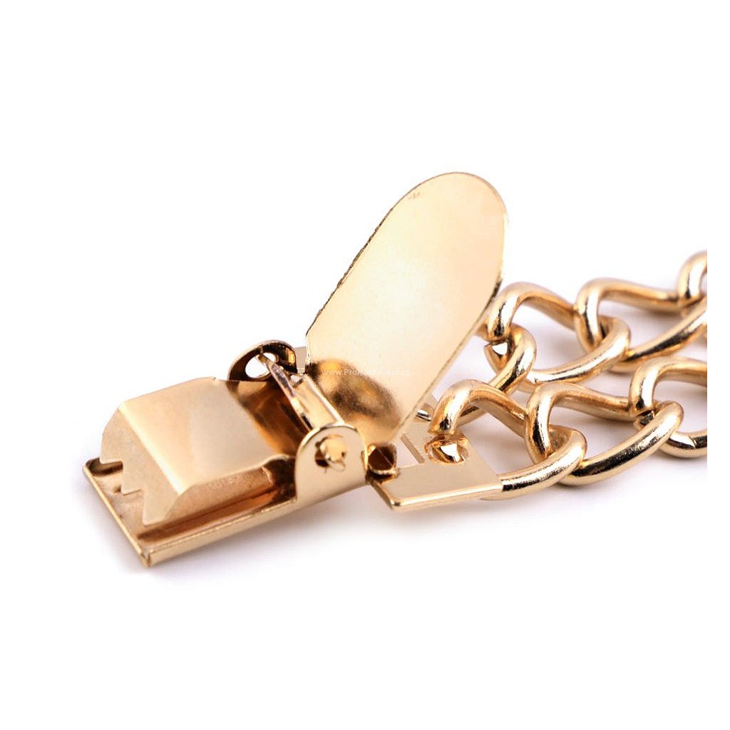 Spona je na každém konci opatřena zapínáním, které připnete k oděvům. Zapínání jsou spojeny dvěma řetízky o průměru 0,9 mm.
