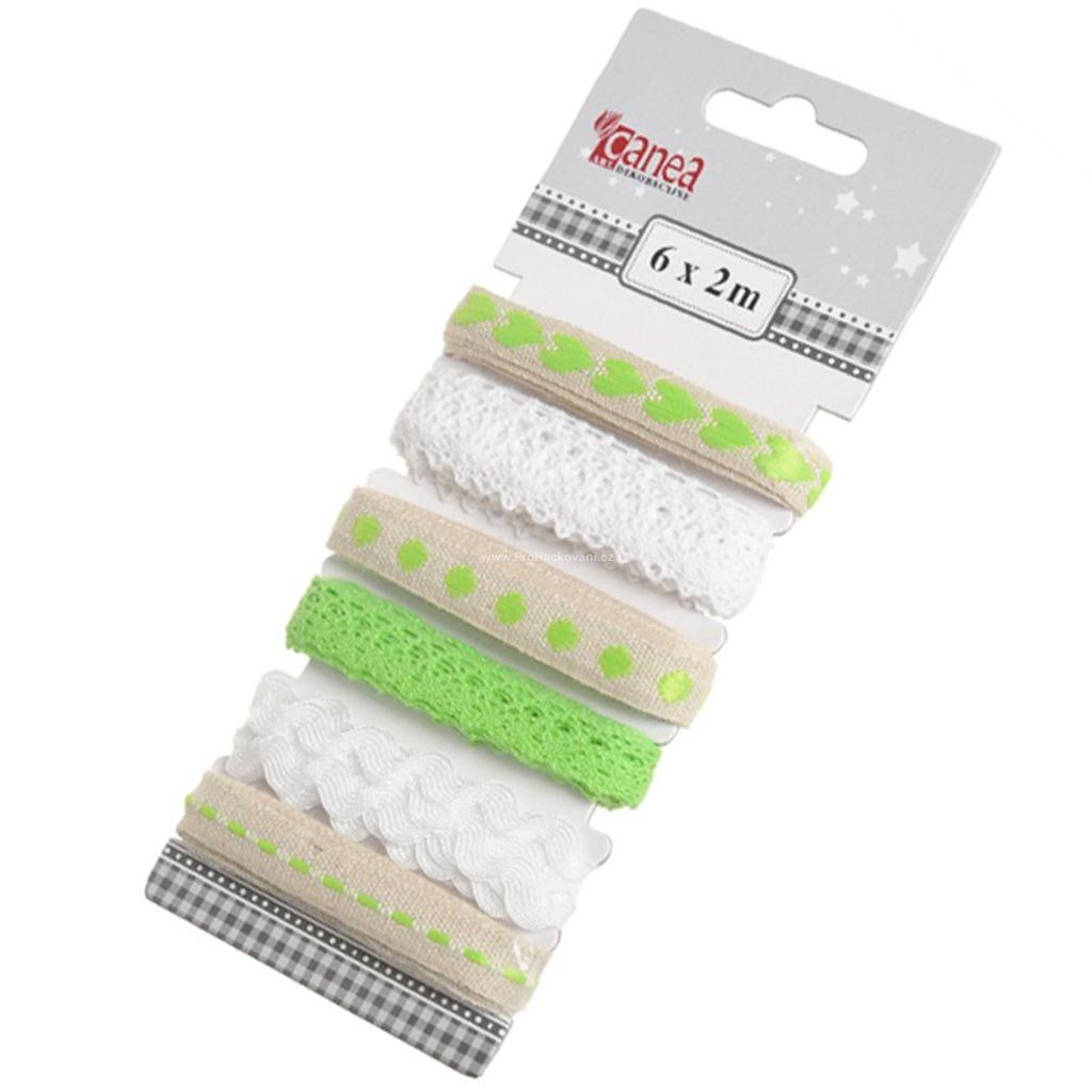 Sada obsahuje: 1 x stuha s puntíky, 1 x stuha se srdíčky, 1 x stuha jednobarevná vlnka, 1 x stuhy s prošíváním a 2 x krajková stuha.
