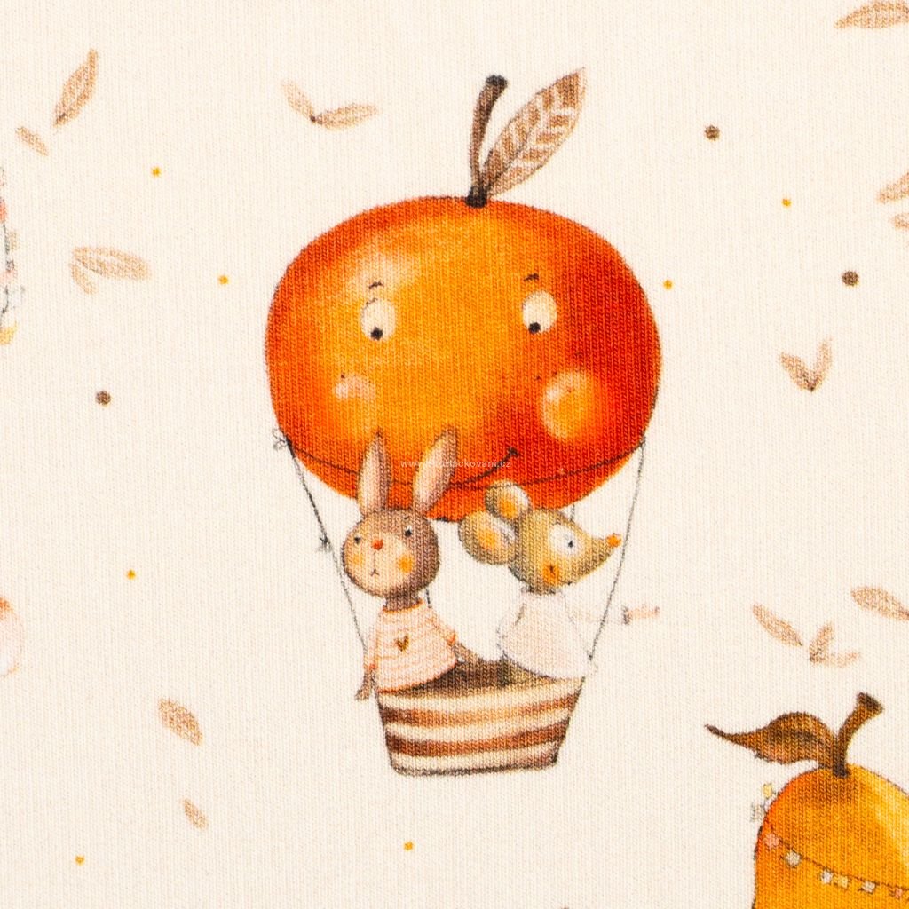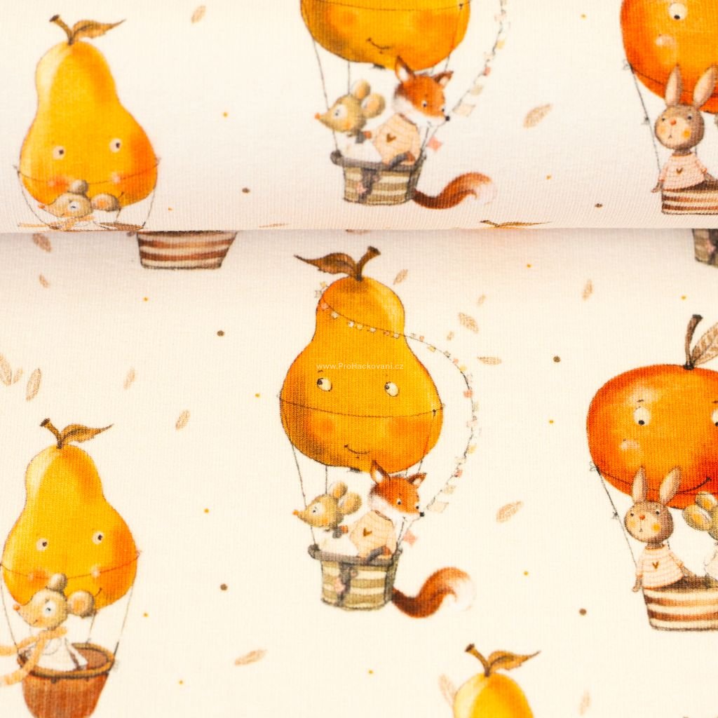 Teplákovina Little Fox & Friends je měkká, pružná látka s dětským motivem, který vypráví příběh malých zvířátek cestujících oblohou v balóncích z jablek a hrušek. Roztomilý králíček, myška a veverka na akvarelově laděném motivu zaujmou každého malého objevitele.