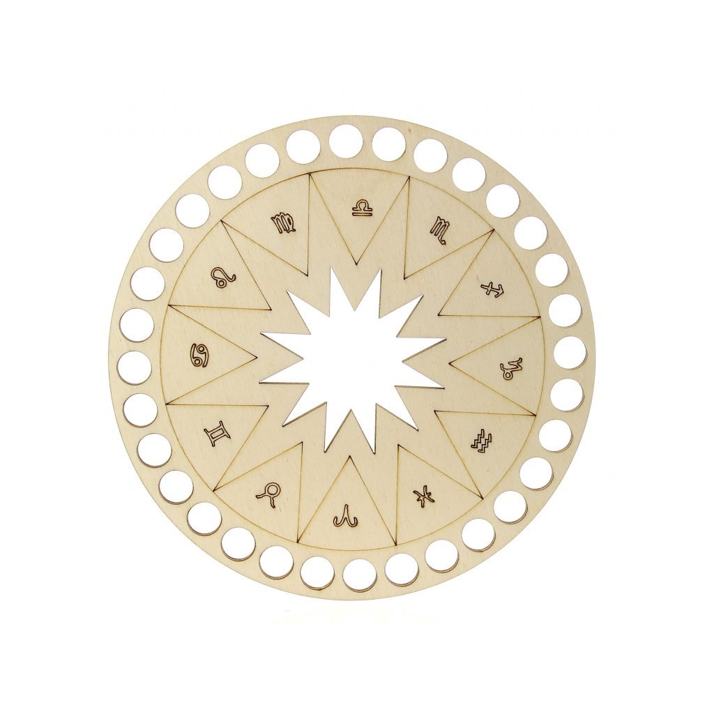 Víko na košík, kruh Ø 15 cm, zdobené vyřezávanou hvězdou uprostřed a okolo vypálená znamení zvěrokruhu.